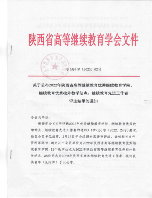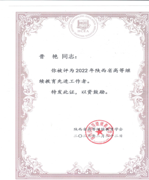 近日,陕西省高等继续教育学会下发了“关于公布2022年陕西省高等继续教育优秀艳照门 、继续教育优秀校外教学站点、继续教育先进工作者评选结果的通知”,经陕西省高等教育学会组织专家评审评选,我校晋艳同志被评为陕西省高等继续教育先进工作者。