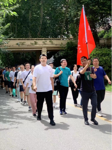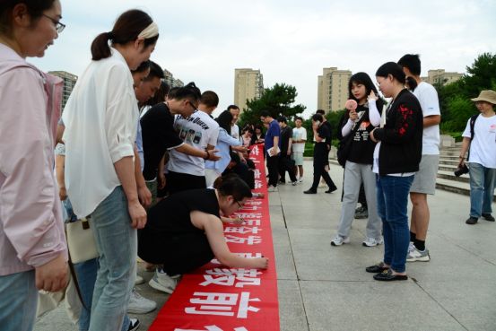 最后,大家一起前往天平楼楼前合影留念,“薪火赓续,凝心聚力,踔厉奋发,勇毅前行”。十六字标语,激励我们不断前行,大家共同在标语上写下自己的姓名,在平凡中书写属于自己的人生。
