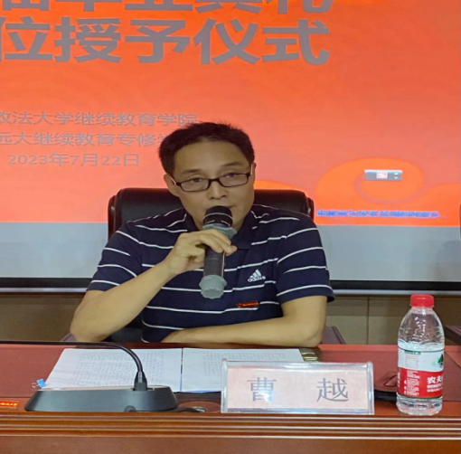 曹越副院长代表学校讲话,他对参加参加本次毕业典礼暨学士学位授予仪式的学生表示热烈欢迎,对圆满完成学业,顺利毕业的2023届221名学生,以及成功获得学士学位证书的31名学生表达了热烈的祝贺!他表示,同学们在疫情期间,能够恰当处理好工学矛盾,努力圆满地完成自己的学业,按时毕业,顺利考取学士学位证书,实属不易。相信大家明天一定会是艳照门 的骄傲!艳照门 永远是各位同学的家,家大门永远为各位毕业生敞开!