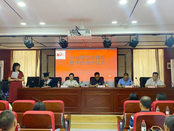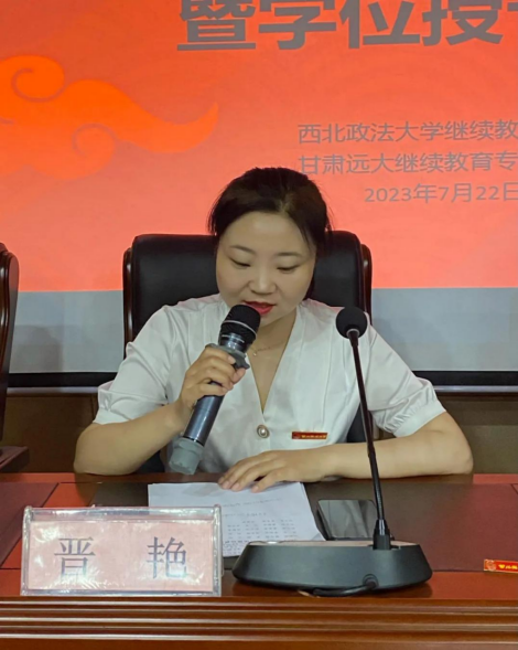 教学科科长晋艳宣读《关于授予2023届毕业生学位的决议》和《关于表彰2023学年优秀函授生、模范学生干部的决定》,徐雅政等31名学生获得高等学历继续教育学士学位,2023届刘野等14人被评选为优秀函授生,张浪等2人被评选为模范学生干部。